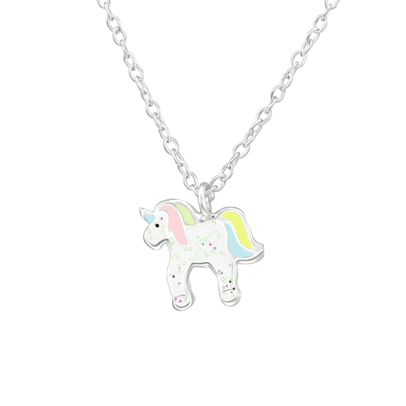 Kinderketting met een eenhoorn. Van een aantal kettingen zijn er ook oorbellen, armbanden en/of ringen beschikbaar, zodat deze als setje gedragen kunnen worden. Bij de gerelateerde producten kan u de verschillende mogelijkheden zien.